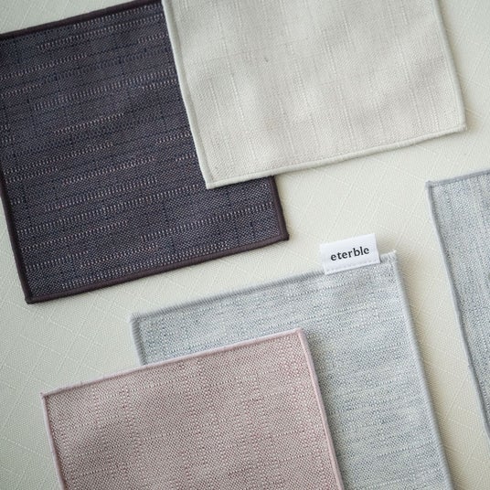 <eterble> エターブルファブリックコースター 1,100円(税込)廃棄されるレンタルクロスを再生した生地のはぎれまで使い切りたい、という想いから生まれました。茶碗袋や大津型バッグなど、お