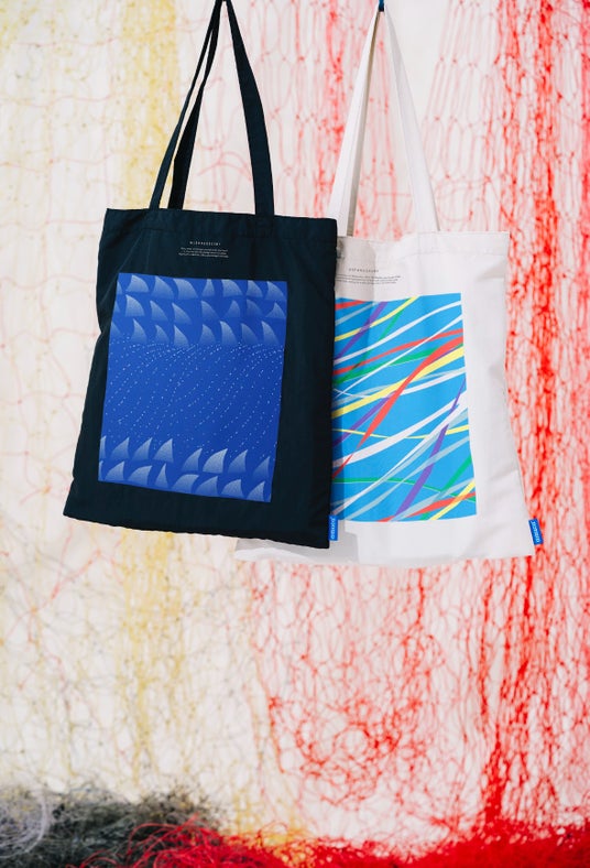 気仙沼の廃漁網を再生した大容量トートバッグ。PCも入るサイズ感で、ロゴ刺繍とテキスタイルの「2つの顔」を気分に合わせて楽しめます。