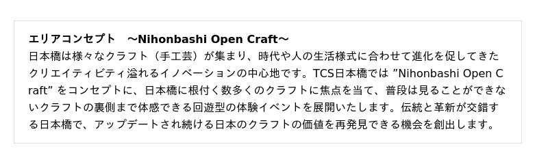 日本橋エリアはイノベーションの中心地として、人や文化、技術、知恵など様々なモノやコトの架け橋となり、新たなものを生み出し続けてきました。本イベントでは、“Nihonbashi Open Craft”をエリアコンセプトに、日本橋に現存する多数のクラフト(手工芸)の価値を生み出す現場にフォーカスし、コンテンツを展開いたします。