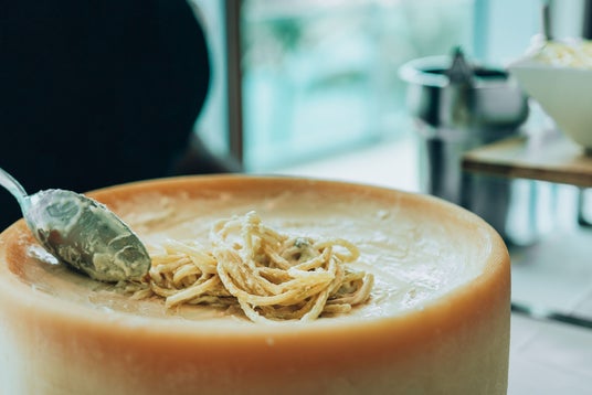 グラナパダーノのチーズパスタ本フェアの目玉メニューの一つ。大きなチーズの器の中で仕上げるパスタは、とろけるチーズがパスタ一本一本に絡みます。
