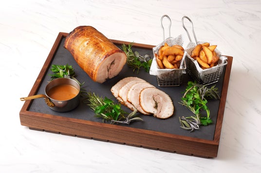 ライブキッチンにて提供「ポルケッタ」ローマ近郊のアリッチャが発祥といわれる郷土料理。豚肉をスパイスやハーブで味付けをし、低温調理でじっくり仕上げました。外側はカリッと、内側はジューシーな肉の旨味を堪能できます。