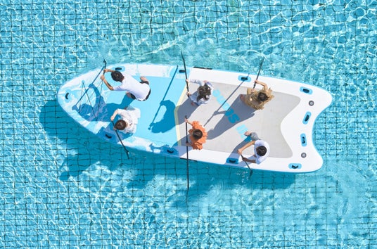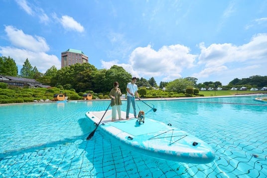 スイスのレマン湖をかたどった全長130mの「ラク・レマンプール」は、宿泊者限定でゆったりとご利用いただける屋外リゾートプールです。リゾート感あふれる遊泳ゾーン、3.5mの深さのあるダイビングスポット、プールデビューに最適な幼児プールの3エリアに分かれており、ご家族そろってお楽しみいただけます。春の訪れを待ち、「ラク・レマンプール」を使用した春のアクティビティとして、ウォータースポーツの新定番「BIG SUPクルージング」がいよいよ解禁。「SUP」は、Stand Up Paddleboard(スタンドアップパドルボード)の略称で、その名の通り、サーフボードの上に立ち、パドルを漕ぎながら水上を進むウォーターアクティビティは爽快です。