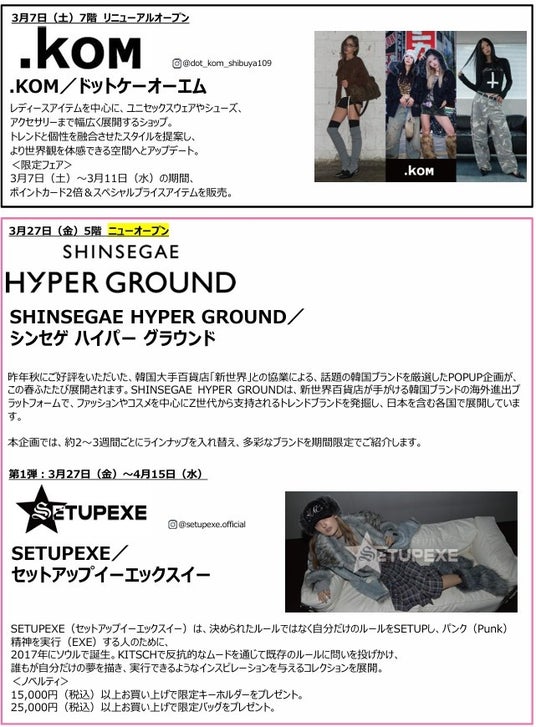 株式会社SHIBUYA109エンタテイメント(本社:東京都渋谷区、代表取締役社長:石川あゆみ)が東京・渋谷で運営する施設「SHIBUYA109渋谷店」では、2026年春、トレンドスイーツおよびレディスブランドを中心とした新規出店・リニューアルを実施いたします。