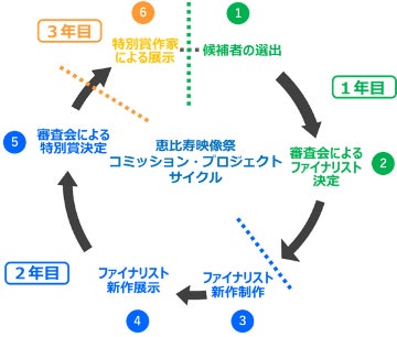 恵比寿映像祭2024より、「コミッション・プロジェクト」は、3年サイクルで実施しています。ファイナリスト決定までの期間およびアーティストの作品制作期間を十分確保し、前回決定した特別賞アーティストの展示とファイナリストの審査、決定を恵比寿映像祭会期中に実施します。アーティストが飛躍していく様子をご期待ください。