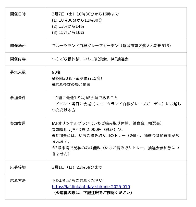 一般社団法人日本自動車連盟(JAF)新潟支部(支部長・町田 一越)は、3月7日(土)に「フルーツランド 白根グレープガーデン(新潟県新潟市南区)」において「JAFデー in フルーツランド白根グレープガーデン」を開催します。