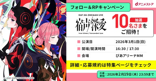 dアニメストア公式Xにて、2026年3月1日(日)にぴあアリーナMM(神奈川)にて開催される『花譜 5th ONE-MAN LIVE 「宿声 / 深愛」』のLIVEご招待キャンペーンもスタート。