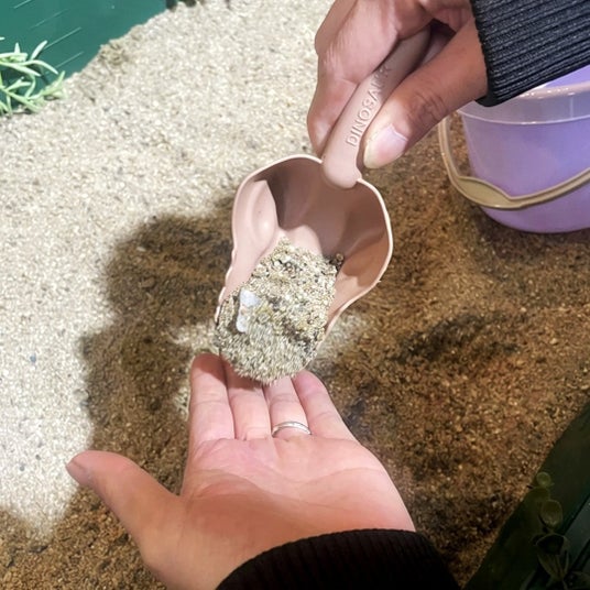 体験の舞台は、宝物が眠る砂でいっぱいの専用スペース。スコップですくうたびに、砂の中から キラリと光る天然石や水晶、カラーストーン が現れます。
