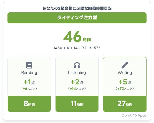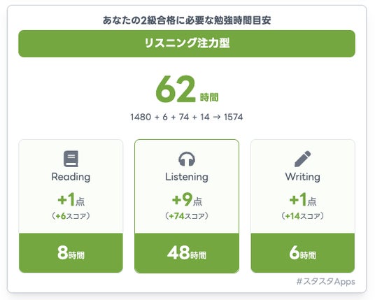 スタディスタジオ株式会社(本社:東京都渋谷区、代表取締役:鈴木孝一)が運営する英検(R)学習支援Webアプリ「スタスタApps」は、英検(R)一次試験の結果をもとに、次回合格に必要な勉強時間と学習プランを提示する機能「合格時間ナビ」を、2025年度第3回(会場試験)の結果発表タイミングに合わせて最適化しました。