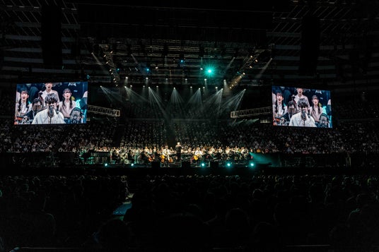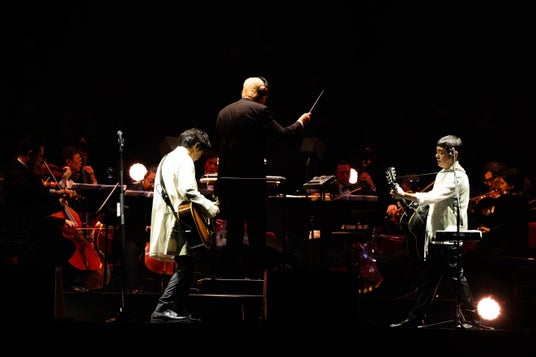 ゆずとThe Symphonic Orchestraが大阪城ホールの舞台で奏でる一夜限りのプレミアムコンサートを、約1万3000人の観客が堪能しました。