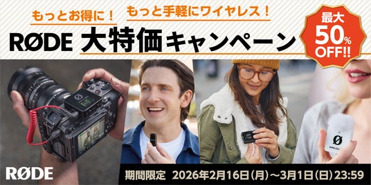 2026年2月16日(月)~3月1日(日)に、RØDE Microphones(ロードマイクロフォンズ)の対象のワイヤレスマイクキットが期間限定の特別価格で手に入る、「もっとお得に!もっと手軽にワイヤレス!RØDE大特価キャンペーン」を実施します。