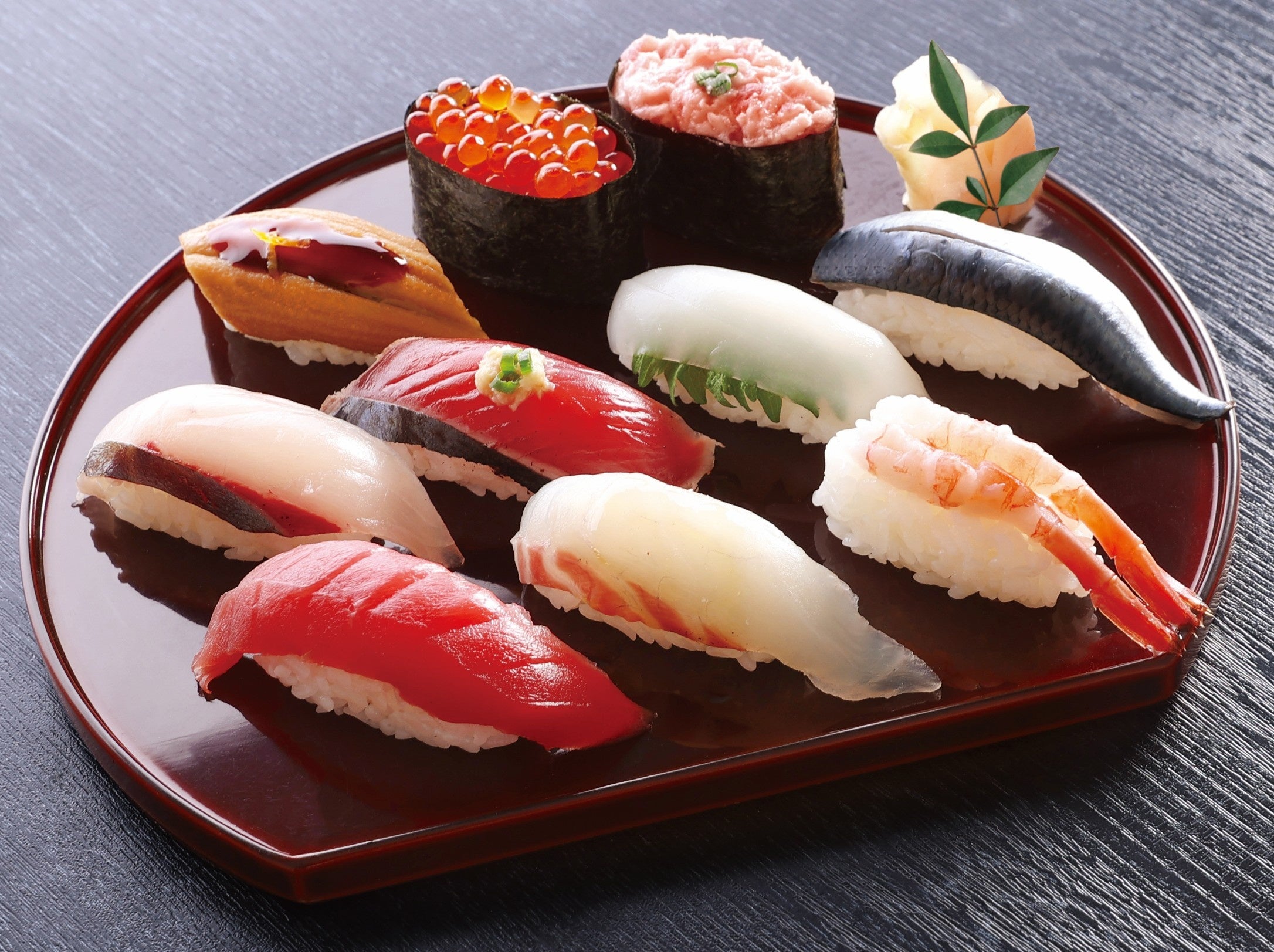 春の旬ネタ5貫<しまあじ・真鯛・鰹のたたき・真いか~しそ添え~・いわし>、まぐろ赤身・甘海老・いくら・ねぎとろ・柚子ふり穴子