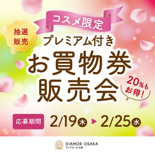 ディアモール大阪のコスメ店舗限定で使えるお買物券6,000円分を5,000円で購入いただける抽選販売会を実施します。お一人様5セット(30,000円相当)まで購入可能です。20%もお得になるこの機会をお見逃しなく!購入にあたり、事前のWEBフォームでの応募が必要です。