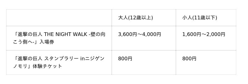 ※「進撃の巨人 THE NIGHT WALK -壁の向こう側へ-」については4歳以下無料