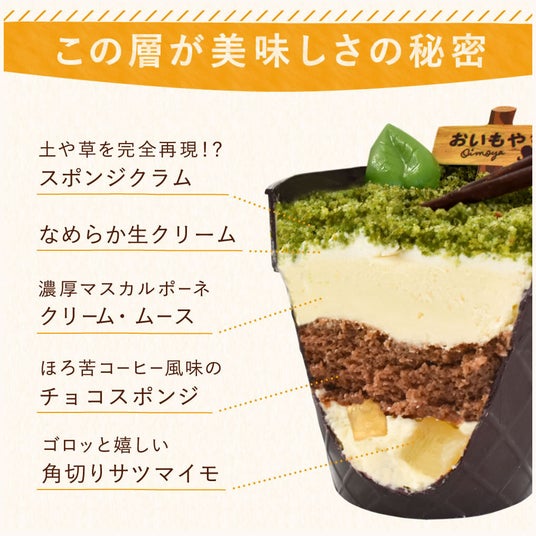 お芋ほりのわくわくや楽しみをお家でも感じてほしい!そんな想いから誕生したのが「芋ほりティラミス」。緑と黒のスポンジクラムでおいも畑のようなリアルな土や草を表現。掘り進めていくと中には角切りのさつまいもが♪お家でさつまいもの収穫体験を楽しめる体験型スイーツです。