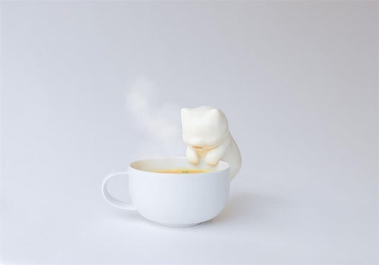 器のフチから顔を出したネコが「ふーふー」して熱い飲み物を冷ましてくれる小型ロボット。