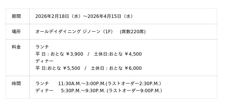沖縄プリンスホテル オーシャンビューぎのわん(沖縄県宜野湾市真志喜3-28-1、総支配人:佐藤 傑)は、オールデイダイニング ジノーン シェフ坂口和史による春のレストランフェア「Spring Harmony」を2026年2月18日(水)から4月15日(水)まで開催いたします。
