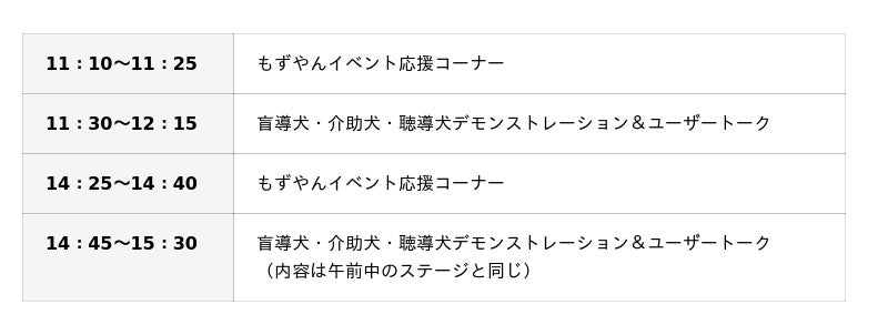 〇内容:身体障害者補助犬(盲導犬、介助犬、聴導犬)に関するお仕事デモンストレーション&ユーザートーク、大阪府副知事もずやん応援コーナー、ワークショップコーナー