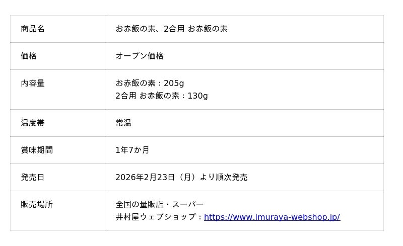 井村屋株式会社(本社:三重県津市高茶屋七丁目1番1号、社長:岩本 康)は、お赤飯の素市場で高いシェアを誇る『お赤飯の素』『2合用 お赤飯の素』を、発売25周年を記念してリニューアルし、2026年2月23日(月)より全国で発売します。