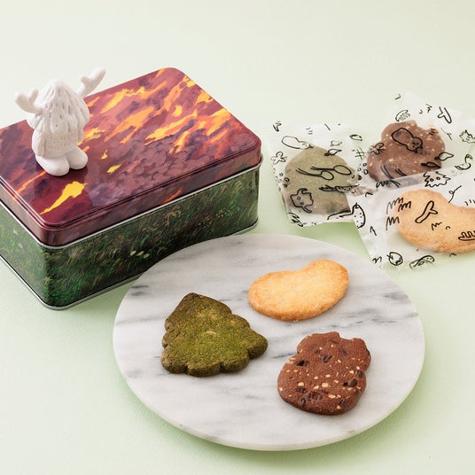 岡山県出身の現代美術作家“平子雄一”が監修。平子雄一×白十字コラボクッキー缶 Sweet Tree WD ¥3,000(税込)
