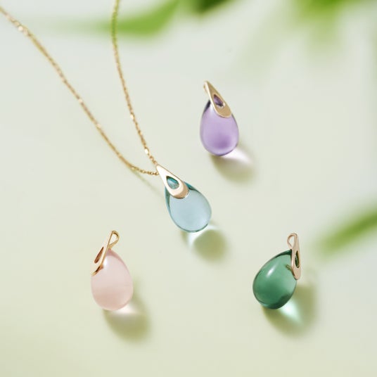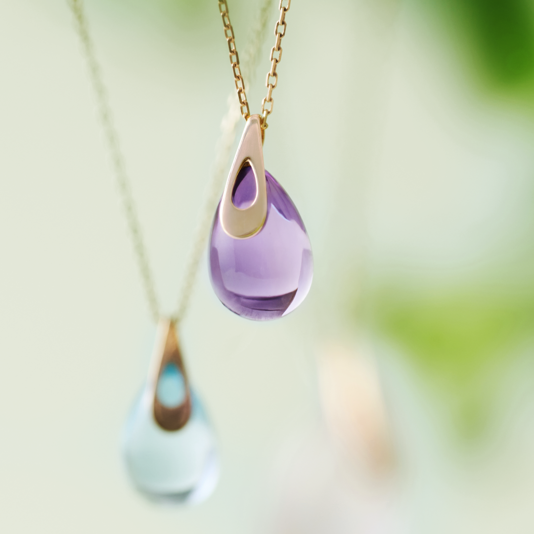 新作ジュエリー「Iro-Tsuyu」は、石の中にたっぷりと光を取り込み、肌の上でみずみずしい透明感を放つのが特徴です。