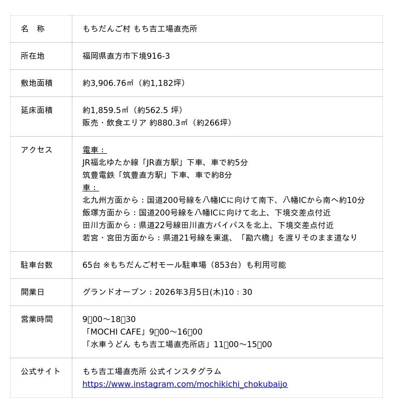 米菓の製造と販売を行う株式会社もち吉(本社:福岡県直方市、代表取締役社長:森田恵子)は、福岡県直方市に「もちだんご村 もち吉工場直売所」を2026年3月5日(木)に新たにオープンします。「もちだんご村 もち吉工場直売所」は、あられ・おせんべいや和菓子、その場で精米したお米が購入できる「販売エリア」、磯辺焼き餅やうどん、できたてのお豆腐が楽しめる「飲食エリア」の2つのエリアの複合施設となっています。