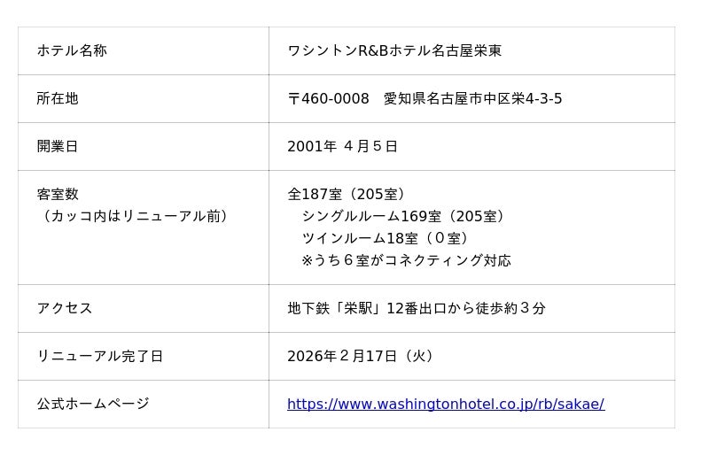 ワシントンホテル株式会社(本社:名古屋市千種区、代表取締役社長:長谷川太)は、2月17日(火)に「ワシントンR&Bホテル名古屋栄東」(全187室)をリニューアルオープンいたします。
