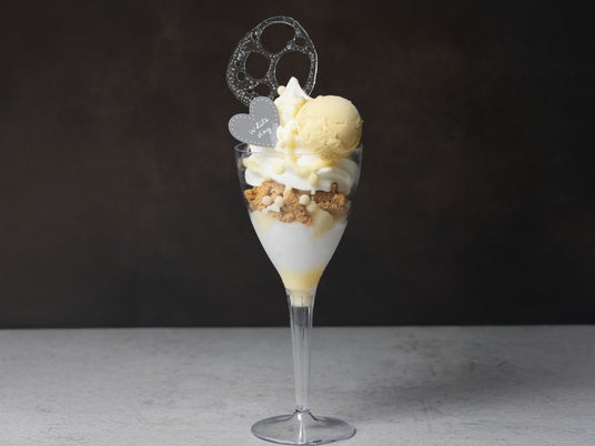 ミルキーでコクのあるジャージーミルクソフトに、グラスバニーユ、サクサクのホワイトチョコパフをトッピング。バニラソースに、はちみつレモンジュレと洋梨を重ね、さわやかな味わいの中に、まろやかさを演出。香ばしい風味のシュトロイゼルをしのばせて、食感のアクセントをプラスしました。バニラの華やかな香りが全体を包み込んだ、優しい味わいのホワイトデーを彩るスイーツをお楽しみください。
