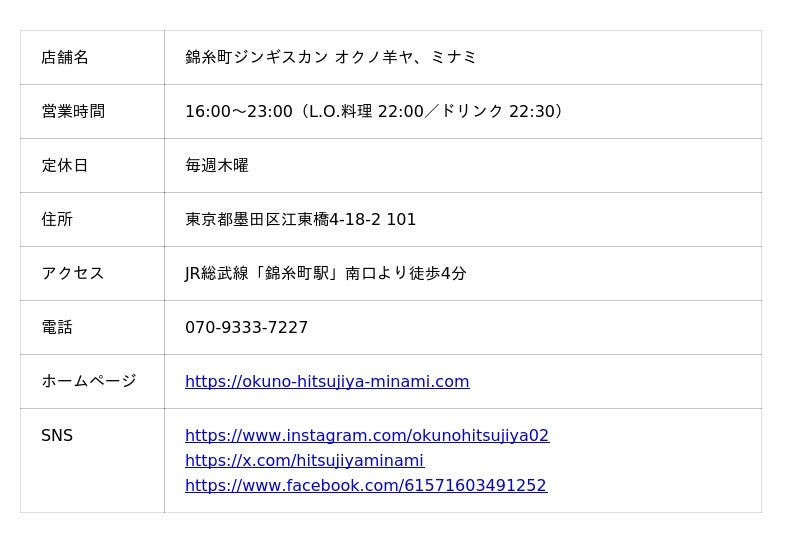 錦糸町駅北口にある本店に続き、南口から徒歩4分の場所に2025年2月オープンした2号店「オクノ羊ヤ、ミナミ」。たくさんのお客様にご来店いただいた感謝を込めて、生ラムをお得にお楽しみいただける特別キャンペーンをご用意しました。