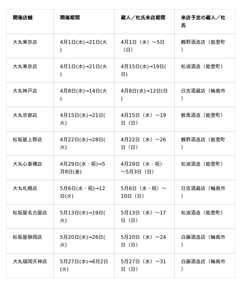 「能登の酒を止めるな!」プロジェクトは、株式会社大丸松坂屋百貨店と連携し、2026年4月より全国9都市の大丸松坂屋各店にて、能登の酒蔵と協力蔵による共同醸造酒と、被災後に自社醸造を再開した酒蔵による日本酒を販売するPOP UPを開催します。
