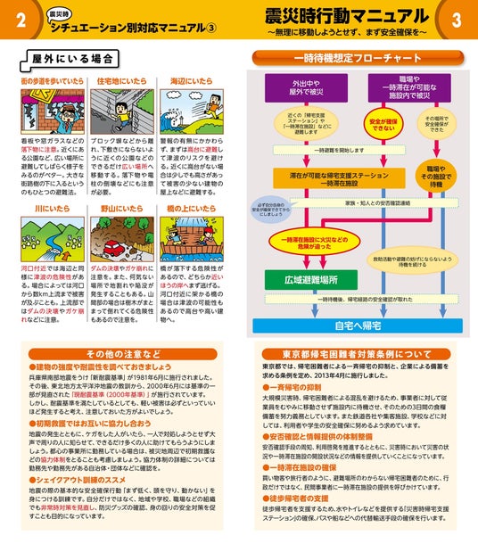 本書は、大地震に具体的に備えられるよう、詳しい付録(防災カード)やシチュエーション別の対応、震災時の行動、徒歩帰宅の各マニュアルをご用意しています。