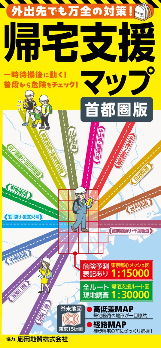 掲載内容面では、地球科学のエキスパートである応用地質株式会社の協力のもと、震災時における主要道路の安全性を3段階の歩行困難度で表示。さらに、独自の実踏調査で確認した危険箇所や、休憩場所も併せて掲載。その他、水・トイレ・情報などを提供する帰宅支援ステーションなどの施設も見やすく表示しています。震災時の行動マニュアル等も詳細かつビジュアルに記載、通勤・通学時のカバンに入れて常時携帯したり、防災セットの中に1冊入れたりしておきたい<危機管理>用地図です。