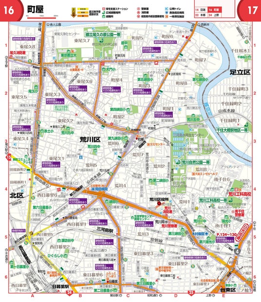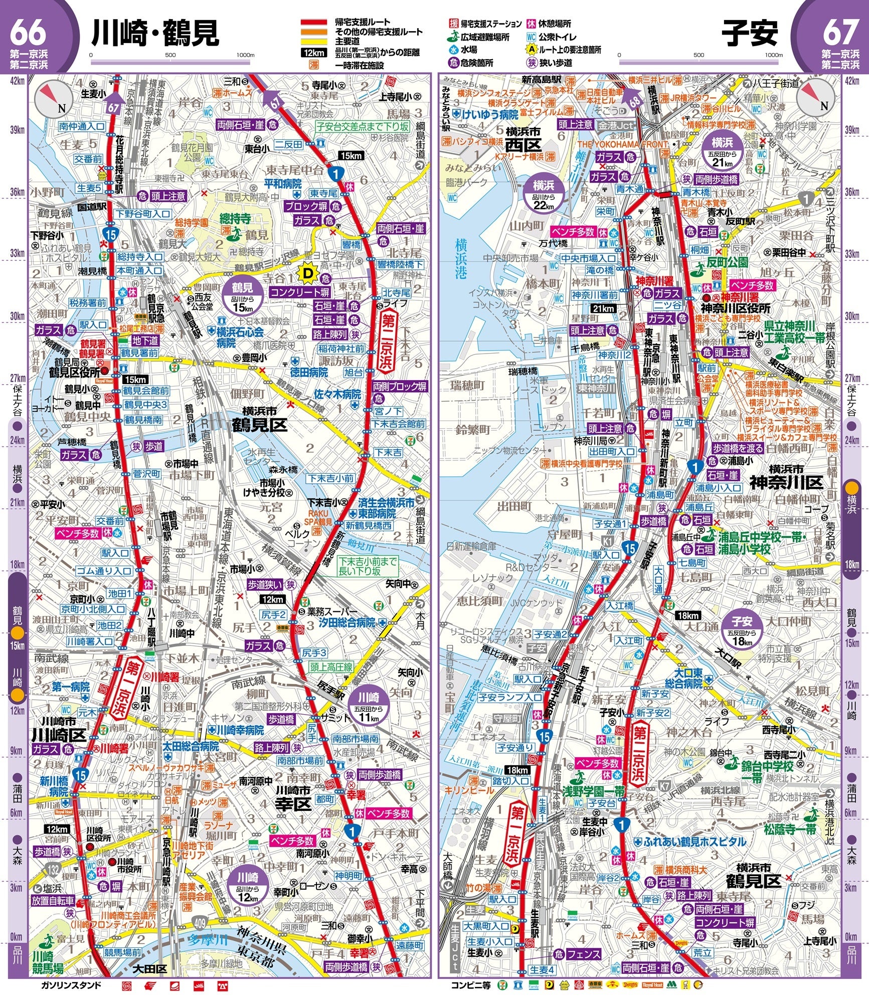 さらに東京都選定の帰宅支援対象道路や、隣接する県の緊急輸送路を中心に、13の帰宅支援ルートを収録。全ルートについて丁寧な実踏調査を重ね、一時待機後に「歩いて帰宅する」ことを想定した情報収集を行っています。ルート図は、都心方向を下に、郊外へ向かう方向を上にすることで、都心からの帰宅の際、前方に見える景色と地図が直感的にマッチしやすいように工夫されています。また、縮尺も全て1: 30,000に統一されていますので、移動の際の距離感が分かりやすくなっています。