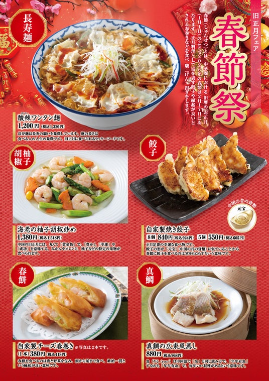 中華圏における旧暦のお正月(1月1日)のことで2026年の春節は2月17日にあたります。正月料理として富を表す餃子や縁起が良いとされる春巻きなどを食べ、験(げん)担ぎをします。※グランドメニュー https://ys-holdings.co.jp/tonkou/?page_id=408