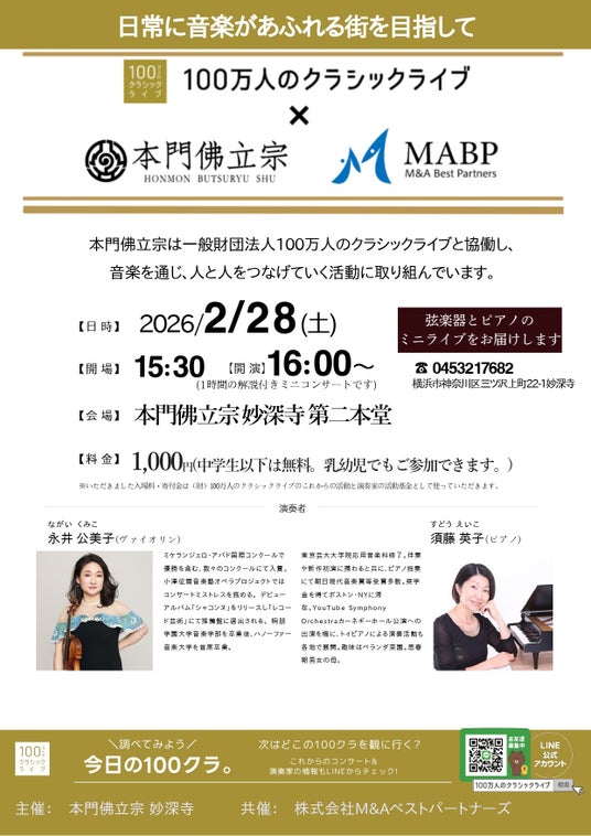 製造、建設、不動産、医療・ヘルスケア、物流、ITに特化したM&A仲介を行う株式会社M&Aベストパートナーズ(本社:東京都千代田区、代表取締役社長:齋藤 達雄 以下M&Aベストパートナーズ)と、一般財団法人100万人のクラシックライブ(東京都千代田区、代表理事:蓑田秀策 以下100万人のクラシックライブ)は、2月28日(土)16:00より、本門佛立宗 妙深寺にて、クラシックライブを開催することをお知らせいたします。