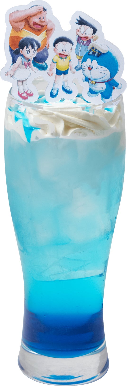 海面に立つドラえもんたちの印象的なシーンを再現するとともに、グラスの中で海底が広がる様子を表現しています。