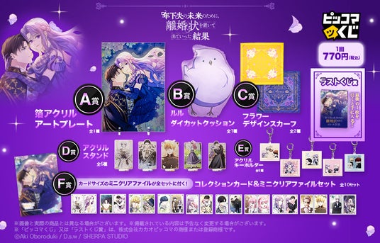 A賞の豪華な箔アクリルアートプレートをはじめ、ルルのクッションや華やかなスカーフなど、ここでしか手に入らない商品が目白押しです。D~F賞には、集めて楽しいアクリルグッズやカードセットをご用意。さらに、ラストくじ賞には、特別なブックレットも!お気に入りのアイテムを狙って、ぜひ挑戦してみてください!- 作品名:年下夫の未来のために、離婚状を置いて出ていった結果