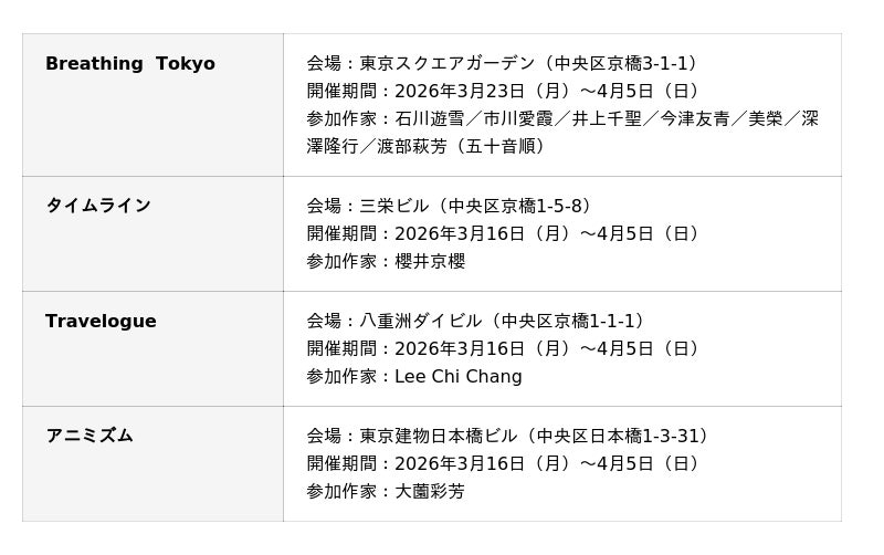 会場:1.東京スクエアガーデン 1階エントランス(中央区京橋3-1-1)2.東京建物日本橋ビル 1階エントランス(中央区日本橋1-3-31)