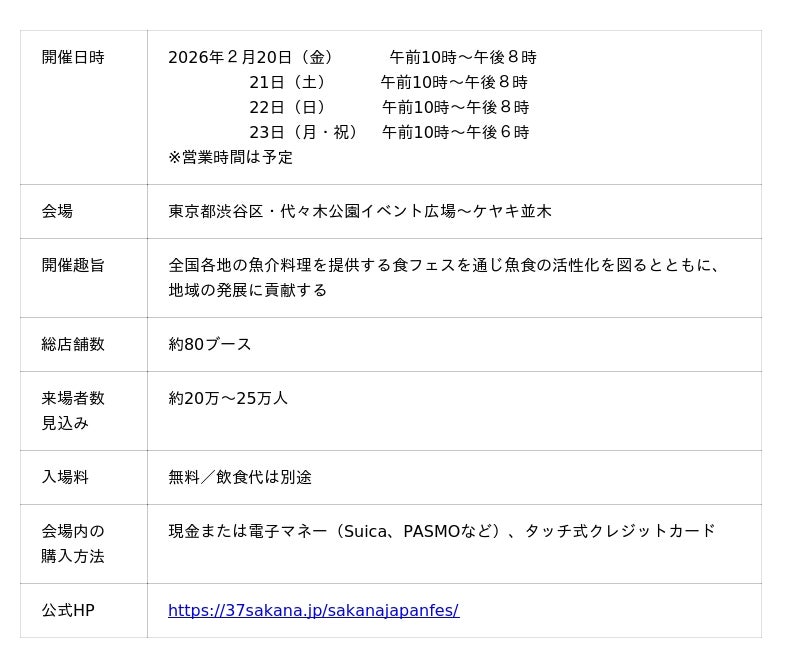 全国各地の魚介グルメが堪能できる「SAKANA&JAPAN FESTIVAL(魚ジャパンフェス)2026 in 代々木公園」(主催・SAKANA&JAPAN FESTIVAL実行委員会)が2026年2月20日(金)~23日(月・祝)の4日間、東京都渋谷区の代々木公園イベント広場~ケヤキ並木で開催されます。四方を海に囲まれた日本の大切な食文化で、栄養豊富な「魚食」の活性化を目的に開催。姉妹イベントを合わせた累計来場者数が約270万人に上る日本最大級の魚介グルメフェスティバルです。