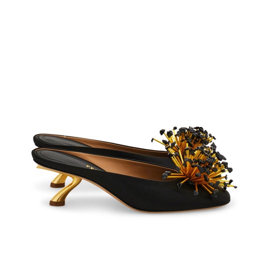 また、伊勢丹新宿店 本館2階 婦人靴/プロモーションでのポップアップストアには、アンティークイエローカラーのソフトなサテン生地のスクエアトゥのミュール、阪急うめだ本店4階 シューズギャラリー コトコト42のポップアップストアには、ヴァンプにガラスビジューをあしらったスペシャルモデルのミュールが、それぞれ先行販売商品として一足早くお目見えし、この特別な機会を盛り上げる。