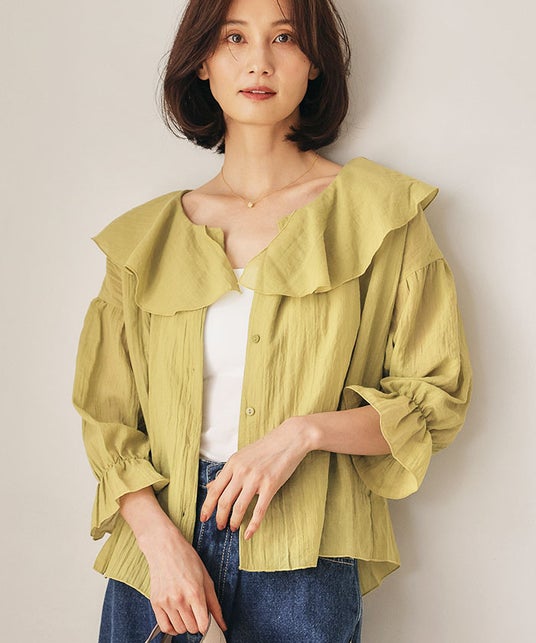 「2wayラッフルフリル襟ブラウス」肩まわりのラッフルデザインが視線を上に誘導。身体のラインを強調せず、ふんわりと包み込むシルエットで華奢見えを叶えます 。