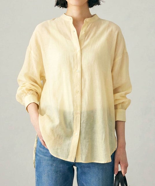 「バンドカラーロングシアーシャツ」デコルテに抜け感を作ることで視線を上に集め、顔まわりをスッキリとした印象に。落ち感のある素材が体型を拾いません 。