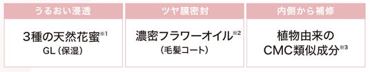パサつく髪に3種の天然花蜜でうるおいを浸透させ、フラワーオイルのツヤ膜で閉じ込めることで髪本来のしなやかさとツヤを引き出します。
