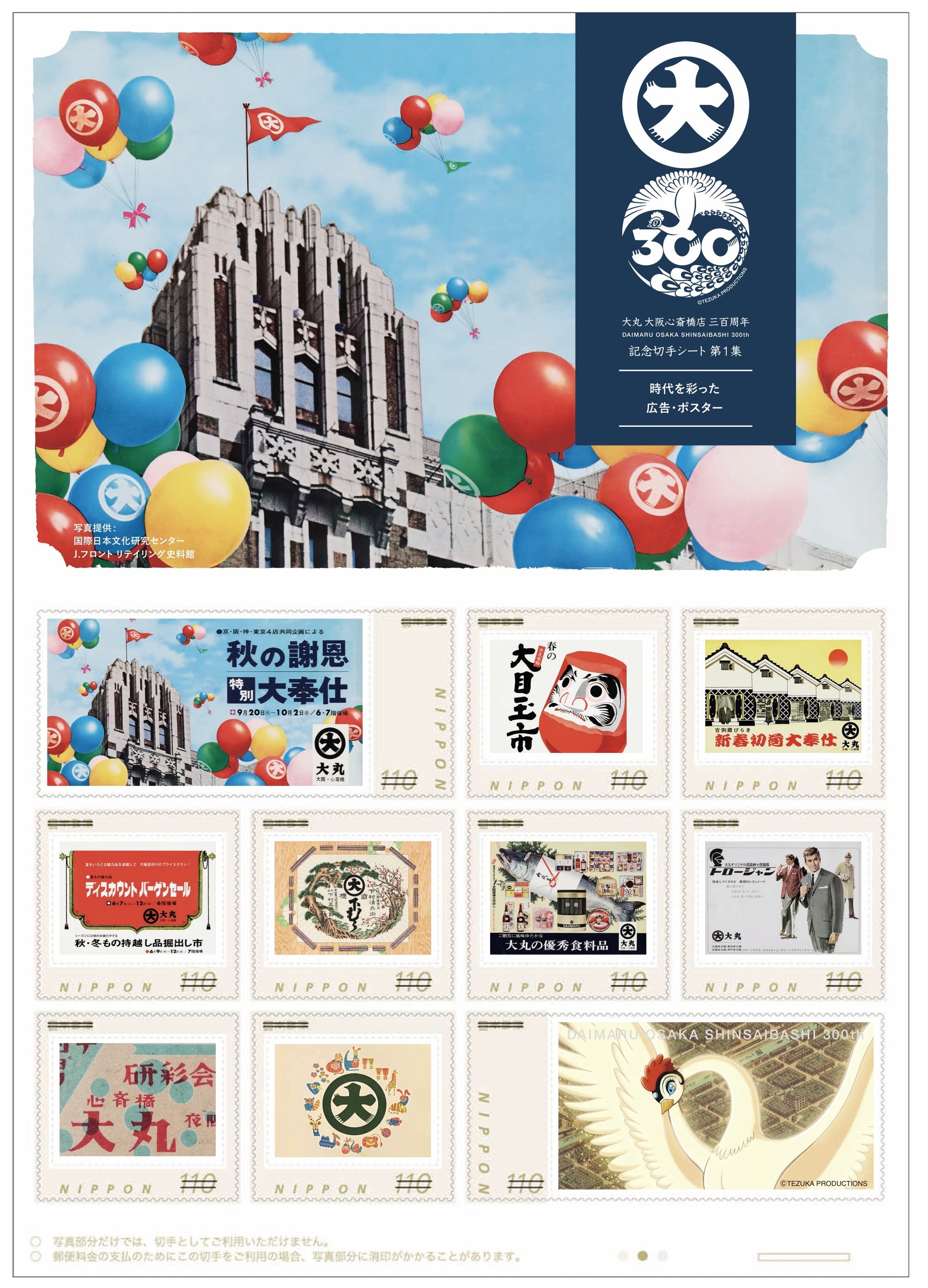 大丸心斎橋店で税込20,000円以上のお買い上げレシート(合算可)をご提示いただいた、大丸・松坂屋アプリ会員の方 各日先着300名様に、記念切手シートをプレゼント。切手には大丸心斎橋店の昭和の広告やポスター、手塚治虫の『火の鳥』がデザインされています。