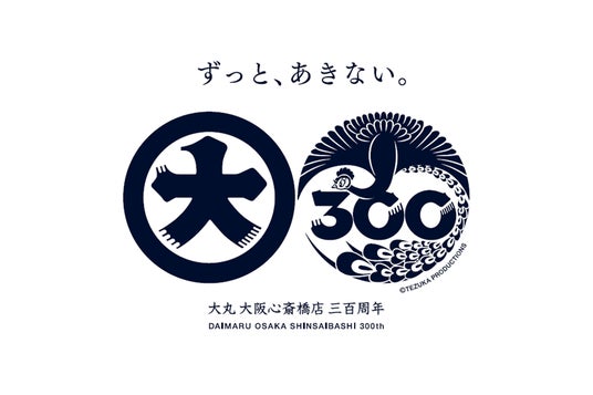 300周年記念ロゴは、大丸心斎橋店 南館の屋上看板として親しまれている大丸の旧ロゴマークと、時空を超える存在である手塚治虫の『火の鳥』をモチーフに制定。過去と未来を象徴するマークを配置しました。紋を想起させるデザインには、呉服屋をルーツとする大丸の「ずっと商いに向き合い続ける」という、変わらぬ思いを込めています。
