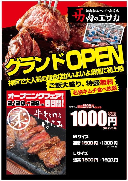 神戸で大人気業態「肉のエサカ」が泉南にてグランドオープン。2026年2月20日(金)からオープン記念キャンペーン第二弾を開催。目玉商品「とろけるハラミステーキ」を1000円(税抜)で販売開始!!