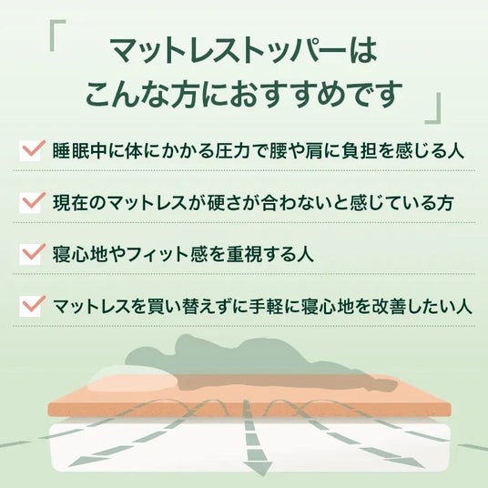 マットレストッパーがおすすめのユーザー例:既存の寝具を活かしながら、手軽に「腰・肩への負担軽減」や「理想の寝心地」を叶えたい方に最適です。
