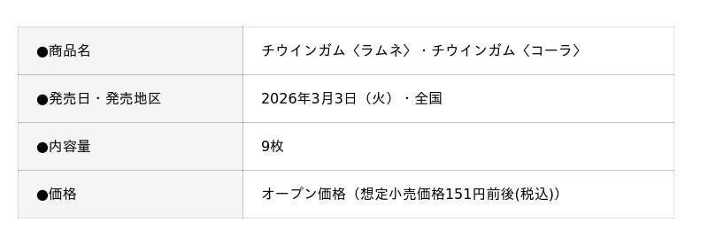 株式会社ロッテ(東京都新宿区、代表取締役社長執行役員:中島英樹、以下ロッテ)は3月3日(火)に「チウインガム〈ラムネ〉」と新フレーバー「チウインガム〈コーラ〉」を全国で発売します。「チウインガム〈ラムネ〉」は2025年3月に発売し、若年層を中心にレトロなデザインが新鮮、かわいいと好評で、出荷実績が計画比の約130%(*) でした。好評につき、今年も発売いたします。新フレーバーにはレトロなイメージに合うドリンク「コーラ」を選定しました。本品はブドウ糖を配合しており、さわやかなラムネ、コーラの味わいがそれぞれ楽しめます。また噛んだ瞬間にはじけるチップによってラムネ、コーラのそれぞれの炭酸感を表現しています。パッケージは昭和のポスターをイメージした縦向きで、どこか懐かしさのあるレトロなデザインとネーミングです。いつでもどこでも気軽に、仕事や勉強などの集中したい時に、ぜひ噛んでスイッチオン!してみてください。