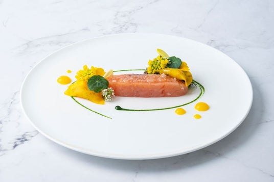 アトランティックサーモンのコンフィ海老のタルタルと蕪のラヴィオリ ミモザのイメージで