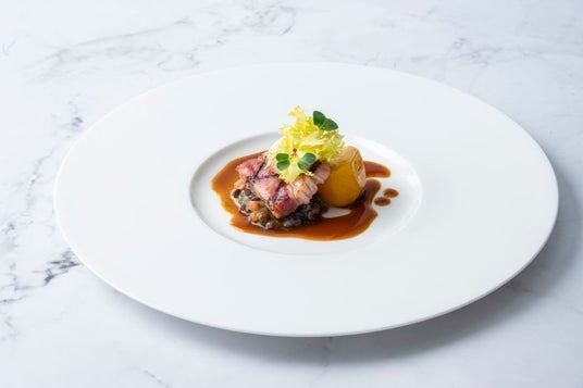 じっくりとスモークしたベーコンをグリルで香ばしく焼き上げ、旨味をしっかりと閉じ込めました。まろやかなレンズ豆のソースを添え、燻香とコクが重なり合う味わいをお楽しみいただける一皿です。