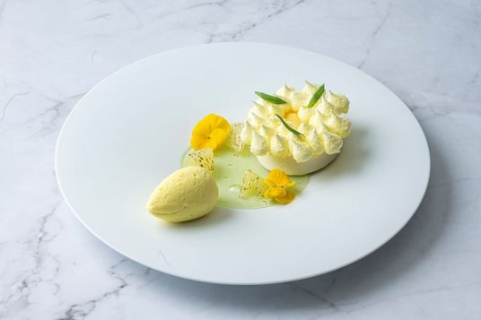 柚子が香るコク深いショコラブランムースを主役に、ミモザに見立てたメレンゲで軽やかな食感のアクセントを重ねました。日向夏のソルベと季節の柑橘を合わせ爽やかな酸味とほのかな苦みで全体を引き締めています。味わいと食感のバランスを追求し、丁寧に作り上げました。